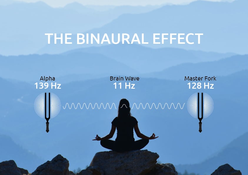 128Hzのフォーク(TTF-128)と一緒に左右の耳元で鳴らすことで、脳に周波数の差を「うなり」として知覚させ、特定の周波数帯域の脳波を誘発させます。