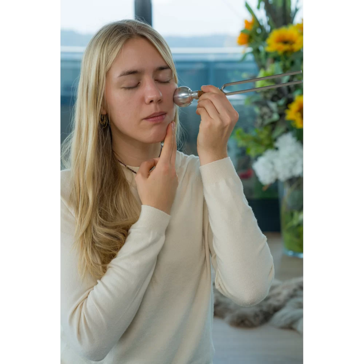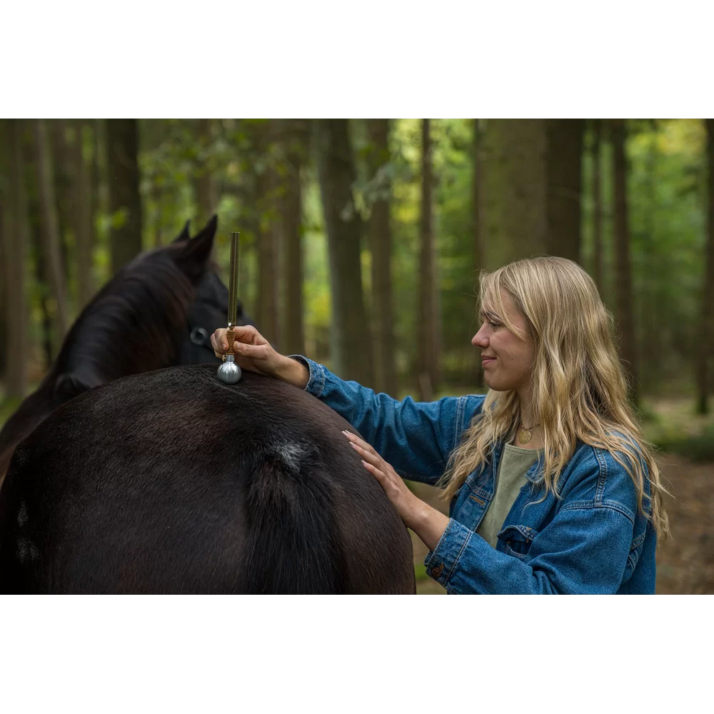 チューニングフォークの根元に取り付けることで、振動をからだの広範囲に伝えることができる専用アタッチメントです。そっとボディへなでるようにご利用ください。